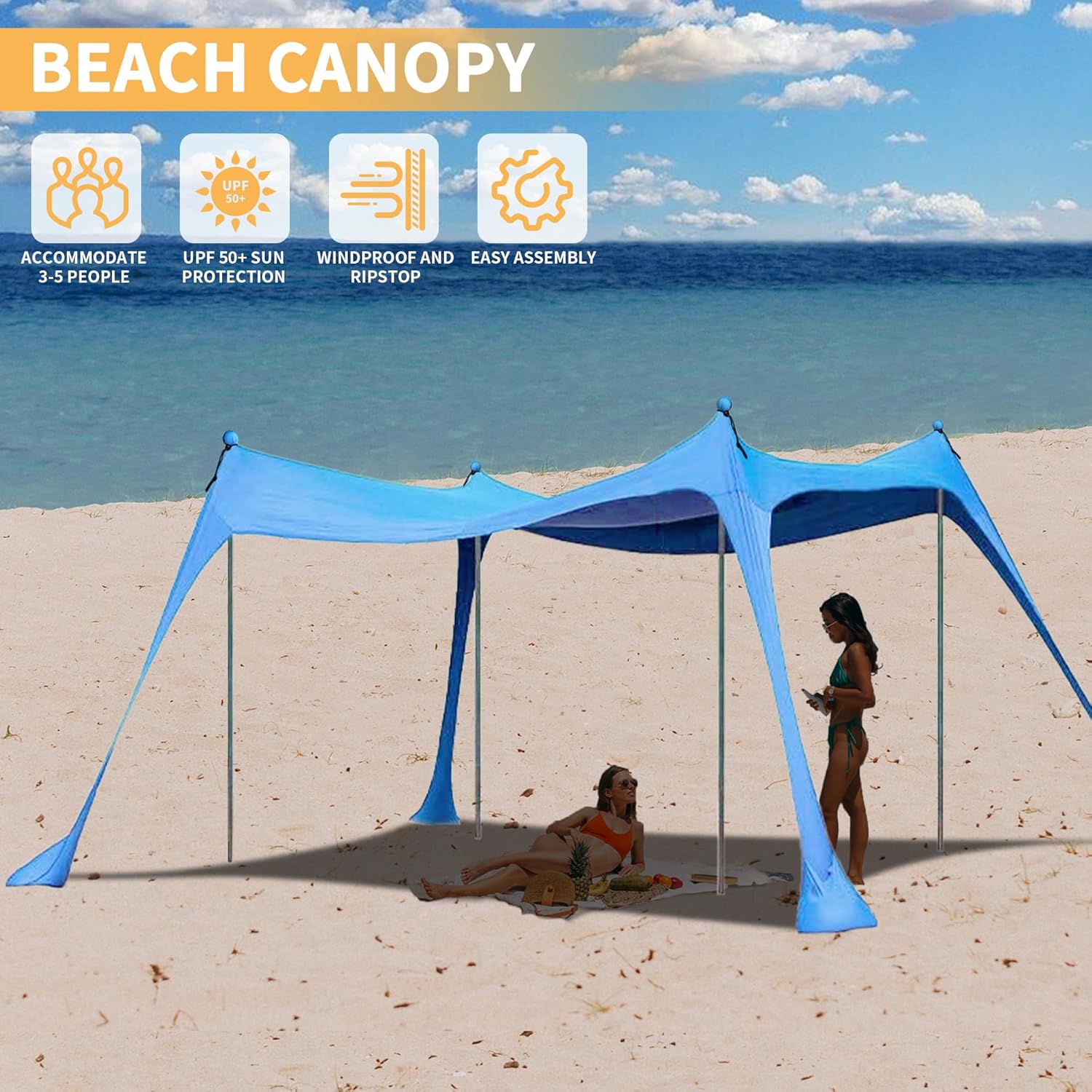 Beach Canopy with 4 Aluminium Poles – UPF 50+ Large Portable Sun Shelter (300 × 300 cm)