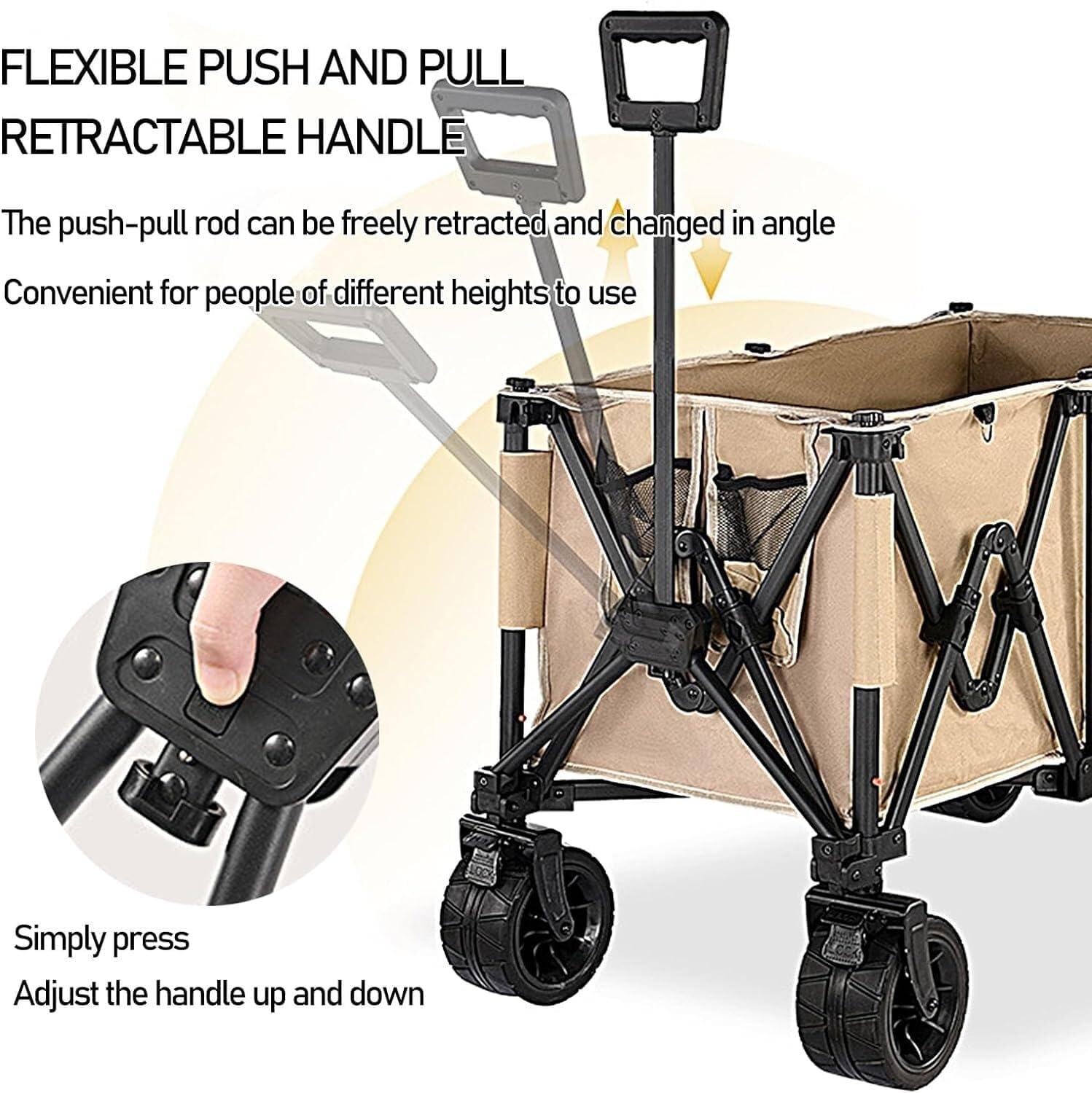 All-terrain wheels ensure smooth movement across sand, gravel, grass and paved surfaces, making this wagon suitable for beach outings, camping trips, picnics, gardening and shopping.
