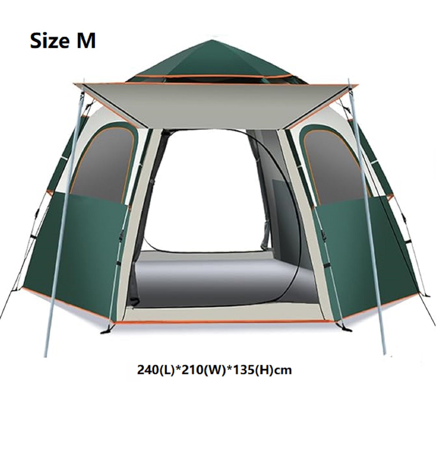The unique hexagonal design, combined with two doors and two windows, creates a spacious and well-ventilated interior, making it comfortable for extended outdoor use.