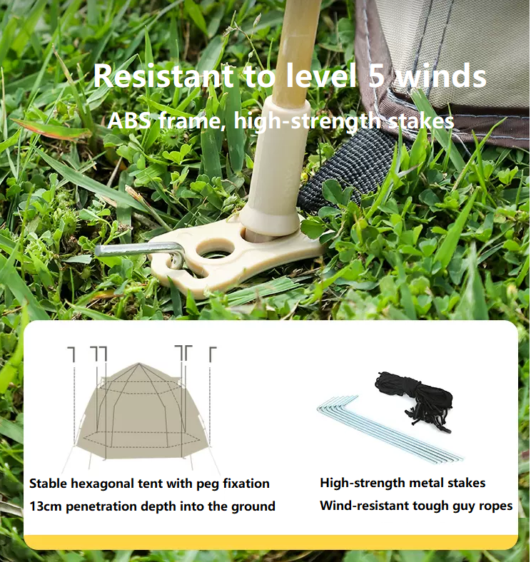 A stable hexagonal structure is achieved through a professional ABS frame paired with high-strength metal stakes, providing excellent overall stability. Enhanced wind resistance is supported by ground pegs with a 13cm penetration depth and durable wind-resistant guy ropes, helping the tent remain secure in windy conditions.