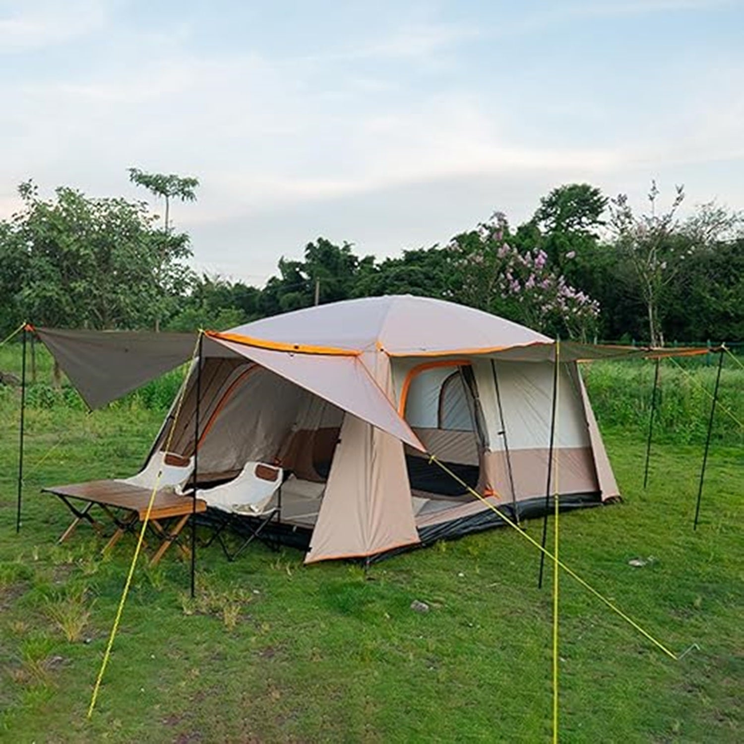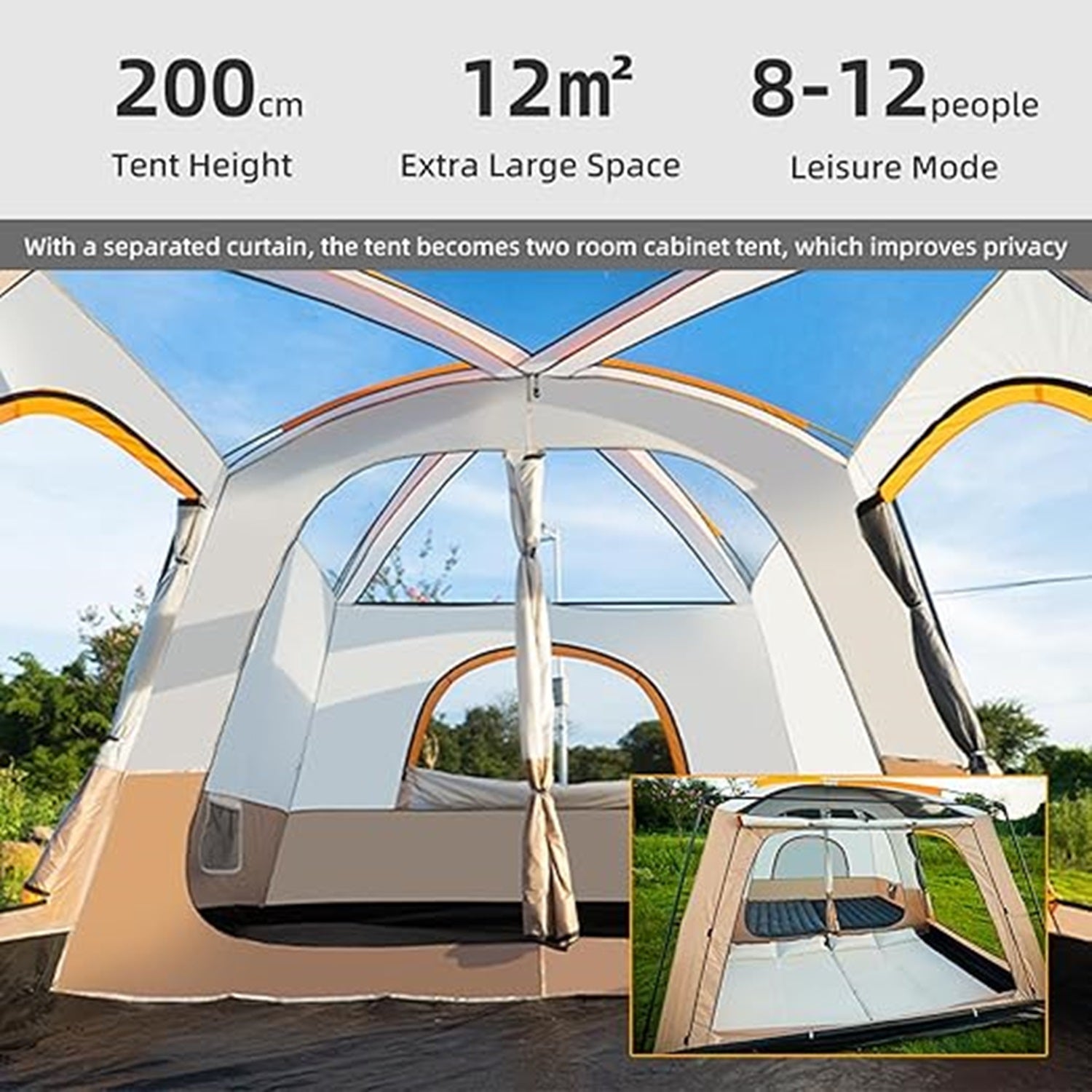 This spacious outdoor canopy tent features two bedrooms and one living room, offering ample space for up to 12 people. With a two-layer fully cover design, it ensures enhanced protection against both rain and sun, keeping you comfortable and dry in all weather conditions.