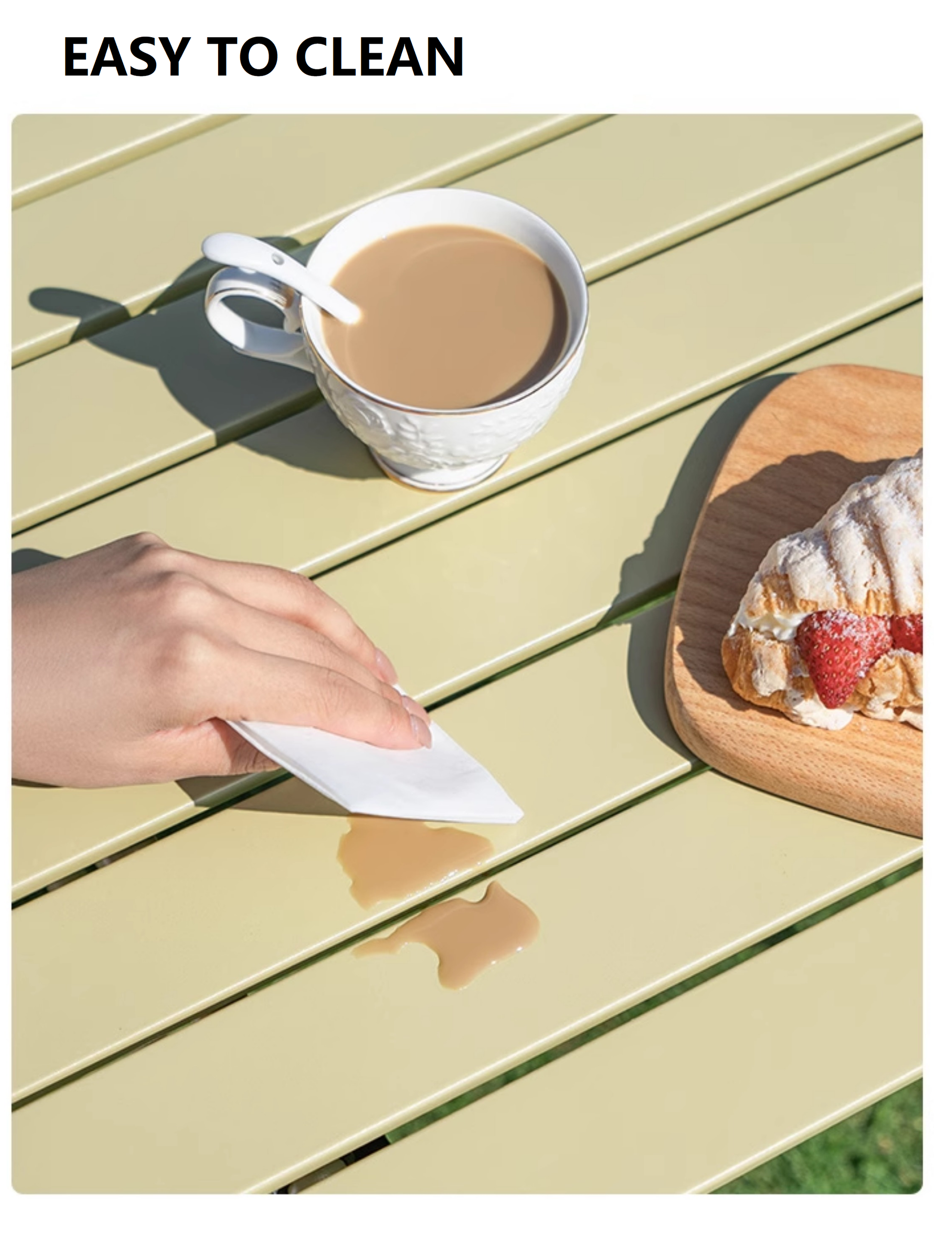 The surface is dirt-resistant and easy to wipe clean, ensuring low maintenance even during outdoor use. Designed to balance elegance and functionality, this folding table enhances your outdoor experience and is ready to go whenever you are.
