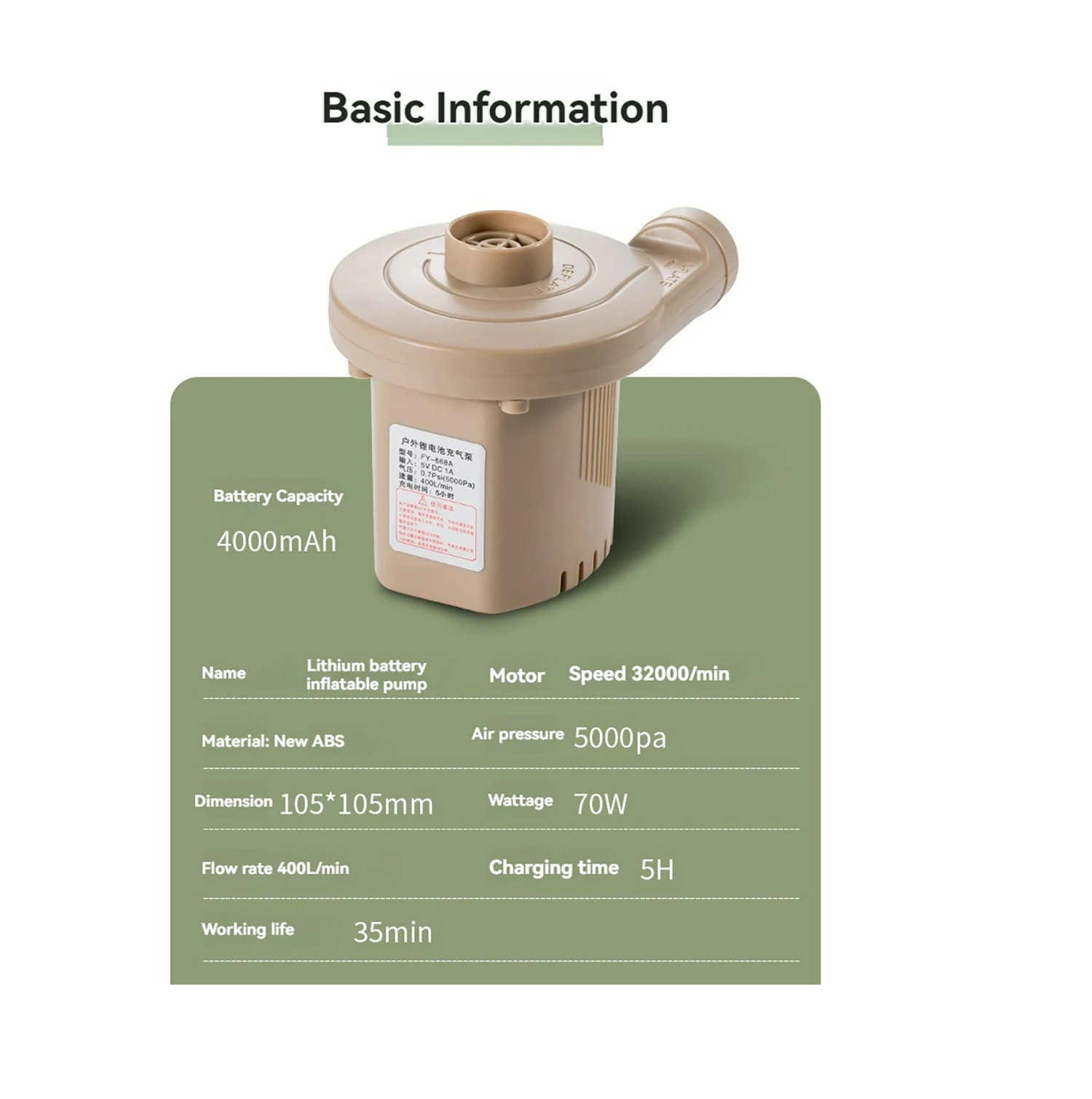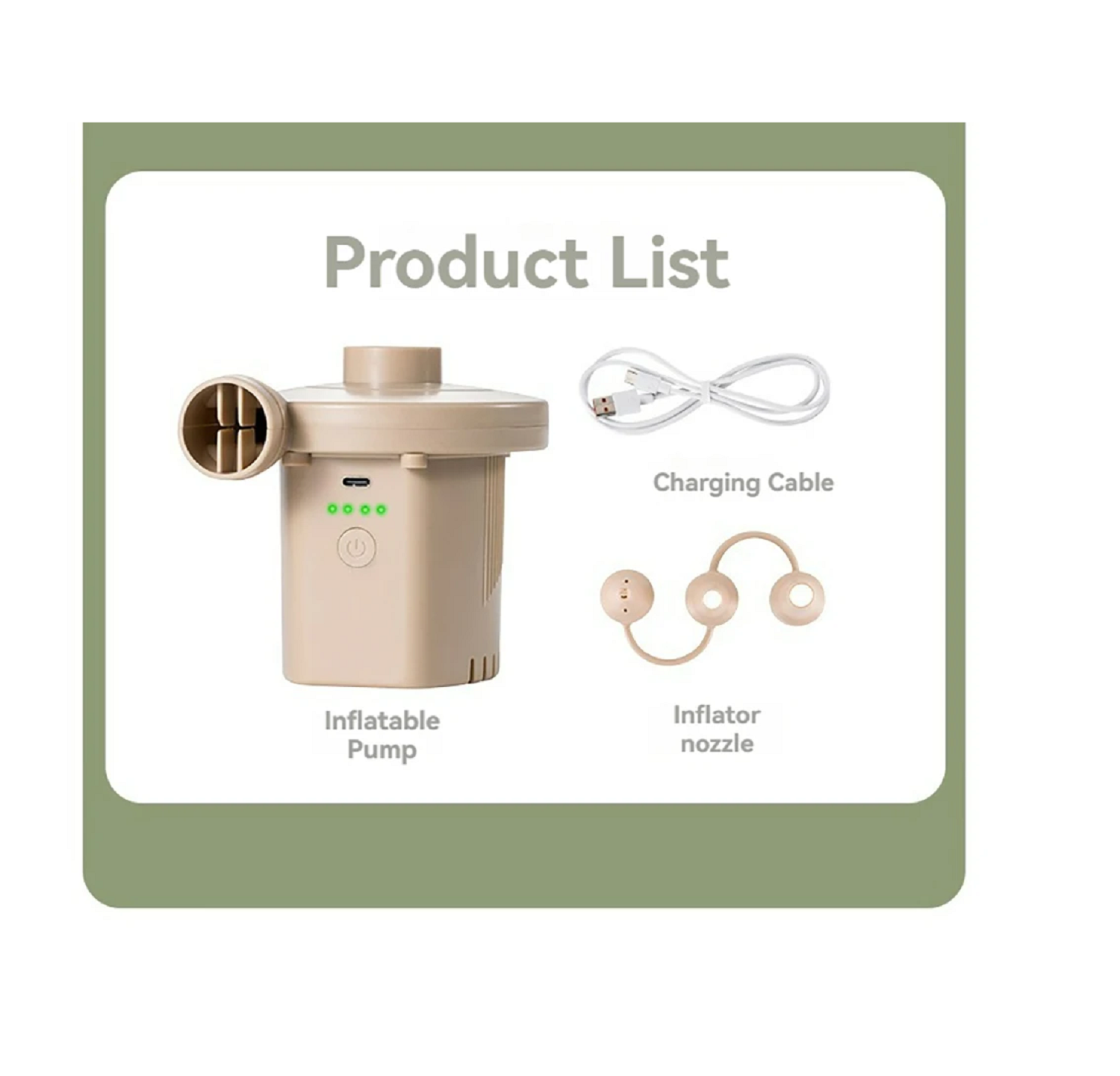 This compact rechargeable air pump delivers strong performance in a lightweight, portable design. Ideal for camping, travel, outdoor activities, and home use.