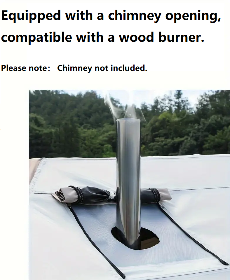 Features a chimney opening compatible with wood stoves for heating and cooking (chimney not included), ideal for colder conditions or outdoor grilling.